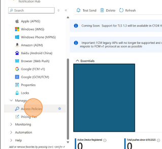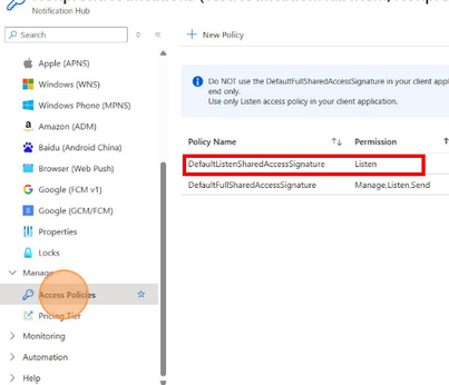 - In the left-hand menu, click on “Manage” and then “Access policies” to configure access for the notification hub.