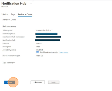 - After reviewing your configuration, click Create to deploy the Notification Hub.