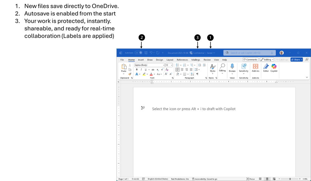 - NEW-Cloud-first creation: Starting today, new documents in Word desktop on Windows (Insiders) now save directly to OneDrive, with autosave enabled your work is protected and ready for real-time collaboration.