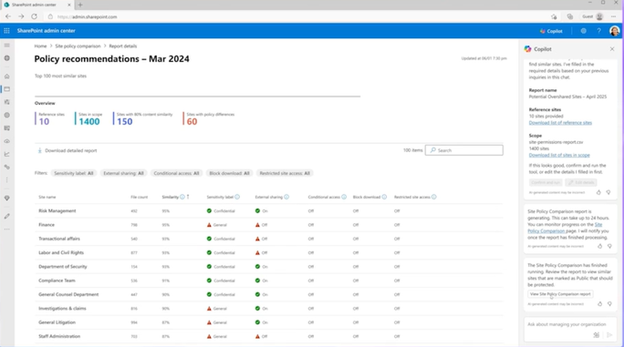 - Copilot in the SharePoint Admin Center: Copilot in the SharePoint Admin Center helps administrators efficiently manage sites, content, and user access. AI insights allow for quick resource location, automated tasks, and instant answers to site management questions.