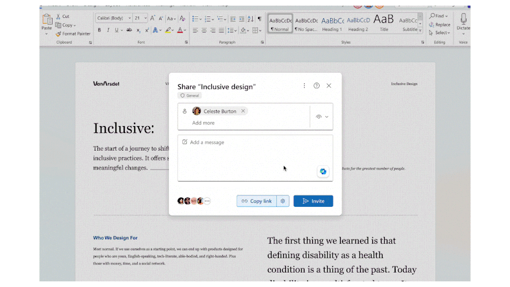 Incorporate document summaries created by Copilot when you share a Word file with colleagues.