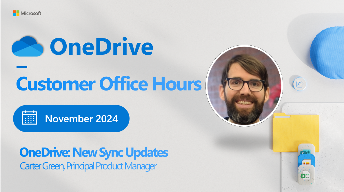 😎 Use this Teams link to register and join live: aka.ms/OneDriveOfficeHours. Each call is recorded and made available on demand shortly after. Our next call is Wednesday, November 20th, 2024, 8:00am - 9:00am PDT. This month's special topic: “New OneDrive Sync Updates" with Carter Green, Principal Product Manager on the Microsoft team.