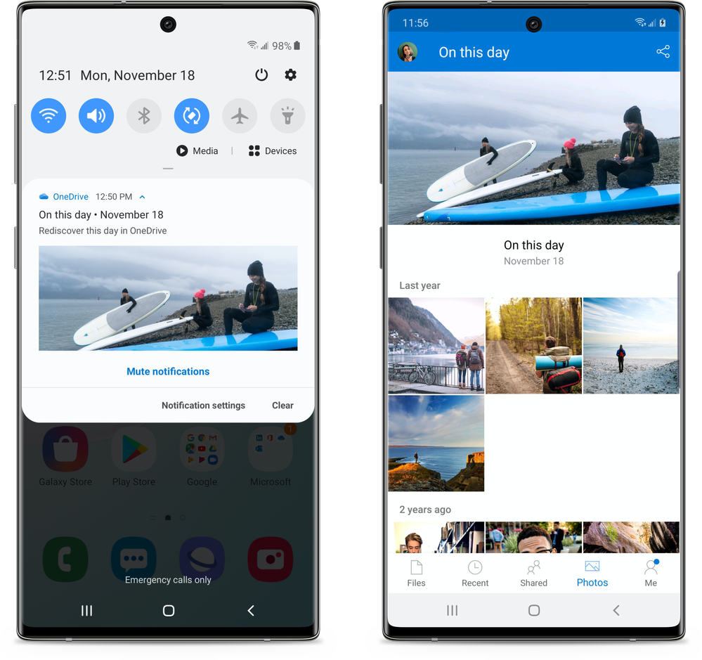 In August, we announced that Microsoft OneDrive will begin powering the photos and cloud storage experience on Samsung Galaxy phones and devices. Samsung is now rolling out the new experience to Galaxy Note10 and Note10+ devices in Europe with the US to follow. Soon your Note10 will natively integrate OneDrive with Samsung Gallery to store your photos and videos in the cloud. When you store your camera roll with OneDrive, your photos and videos will be backed up, protected, and accessible from your phone, PC, Mac, and web browser. With your photos in OneDrive, you’ll won’t need to worry about losing a memory even if you lose your phone.