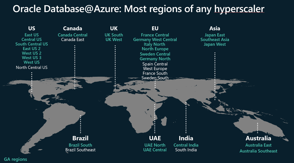 Oracle Database@Azure is now available in 25 regions globally and 40 Availability Zones worldwide, including Australia East, Australia Southeast, Brazil South, Canada Central, Central India, Central US, East US, East US 2, France Central, Germany North, Germany West Central, Italy North, Japan East, Japan West, North Europe, Southeast Asia, South Central US, Sweden Central, UAE Central, UAE North, UK South, UK West, West US, West US2, and West US3. By the end of 2025, the service will expand to 8 additional regions, enhancing scalability and resilience worldwide. Three multi-zone regions will include Spain Central, Switzerland North, and West Europe. Five single-zone regions will include Brazil Southeast, Canada East, France South, North Central US, and South India.