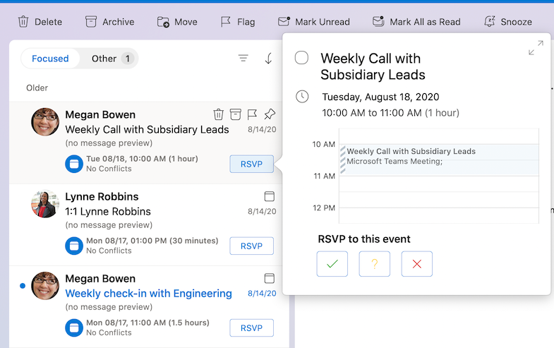 The new Outlook for Mac continues to improve, to help you focus on what matters. Without leaving your inbox, you can now respond (RSVP) to events right from your message list and share an email to Teams.