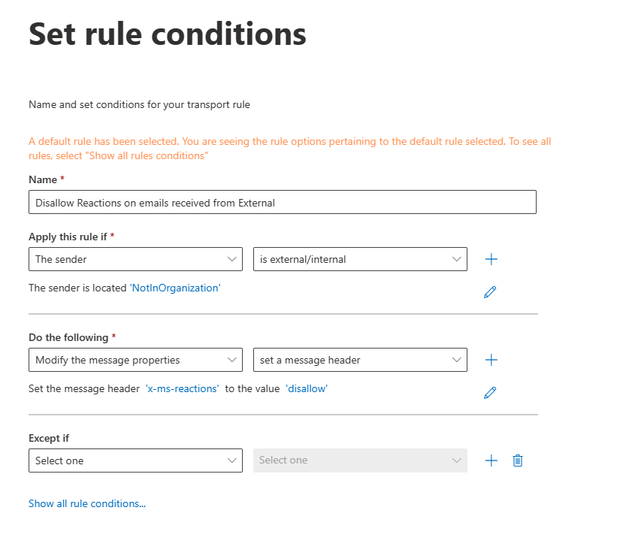 Additionally, tenant admins can set up Mail flow rules (Transport rules) to automatically stamp the x-ms-reactions: disallow SMTP header when appropriate. Here is an example rule that disallows reactions on emails received from outside the organization: