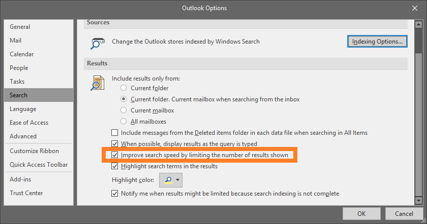- Disable Outlook 2016's use of FAST search via policy or local user registry setting (see the next section)