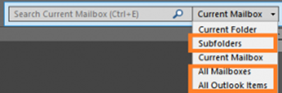 - Change the search scope to All Outlook Items, Subfolders, or All Mailboxes