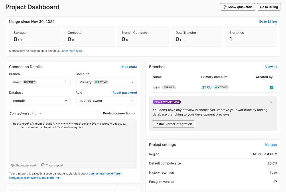 Proceed to create your first Neon project. When this project is created, a default branch and database is created as well. Visit the project dashboard to view project details.