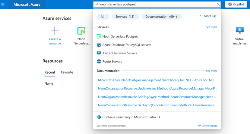 You can start your journey either from Azure portal or Azure Marketplace. Search for Neon Serverless Postgres in the search bar and select the offering.