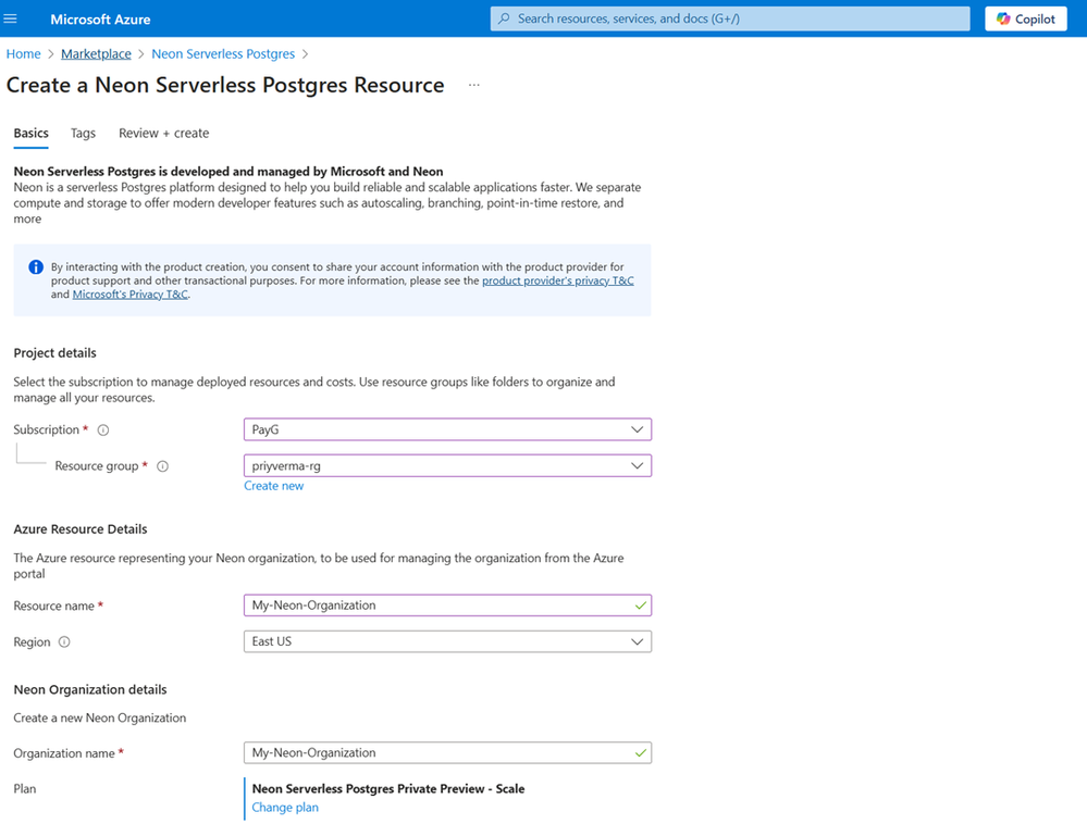 You can find the details of how to create a Neon organization from Azure in the Microsoft docs. The section below summarizes the key steps which will aid you in resource creation.