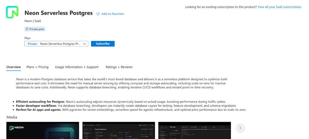 - Subscribe to Neon Serverless Postgres on Azure portal or Azure Marketplace