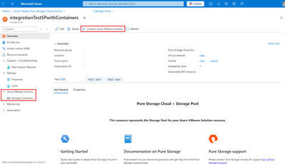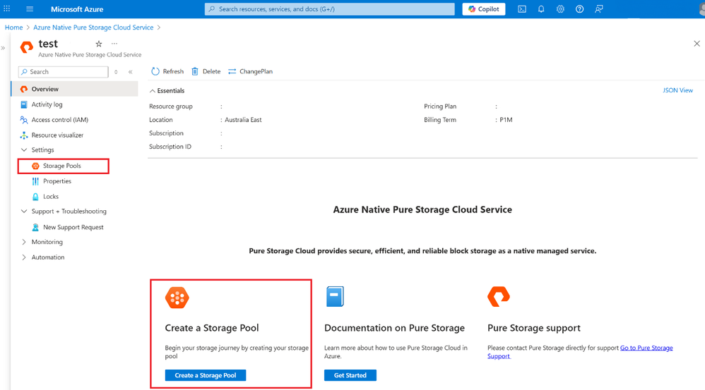 Using your Vnet and a delegated subnet to PureStorage.Block/storagePools, use the Overview blade navigation or the Action tile in the bottom to create and configure your storage pools.