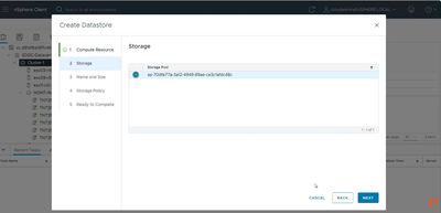 Fig 7: Creation of a Datastore within the vSphere Client – this maps to a Storage container on your Pure Storage Cloud resource