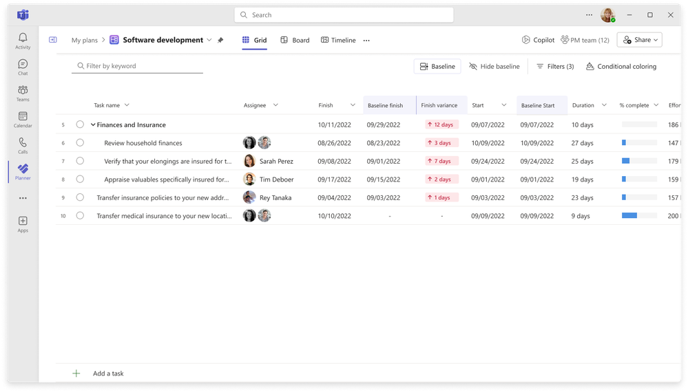 Users with a Planner and Project Plan 3 or Planner and Project Plan 5 license can leverage these enhancements in the Planner app in Microsoft Teams and Planner for the web by following the steps below. Please note, if you do not have a Plan 3 or Plan 5 license, simply select the diamond icon within the Planner app, where you can sign up for your free 30-day trial of advanced capabilities (including the Baseline feature) or request a license from your admin.