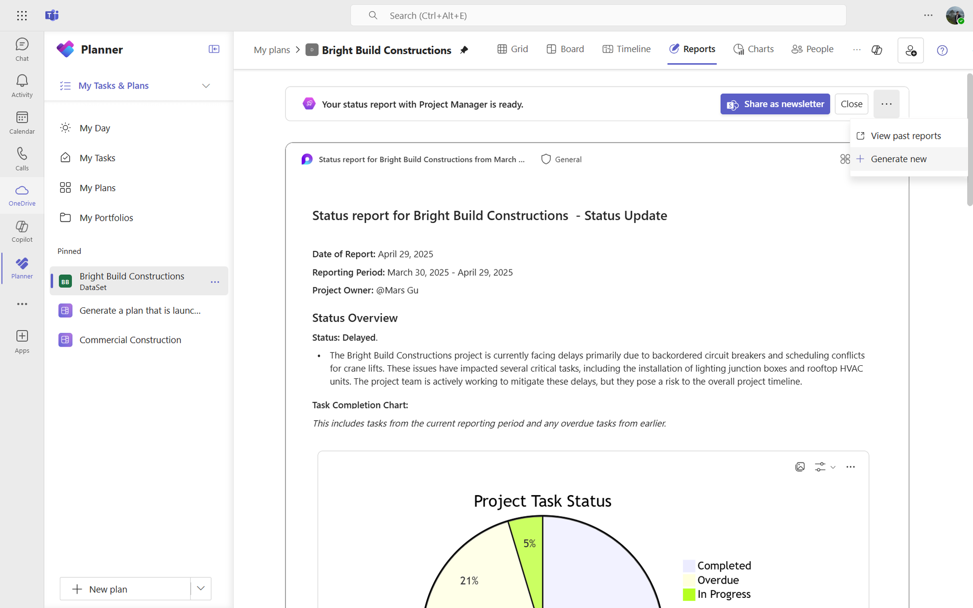 With Status Reports in Planner, powered by Project Manager, you can now: