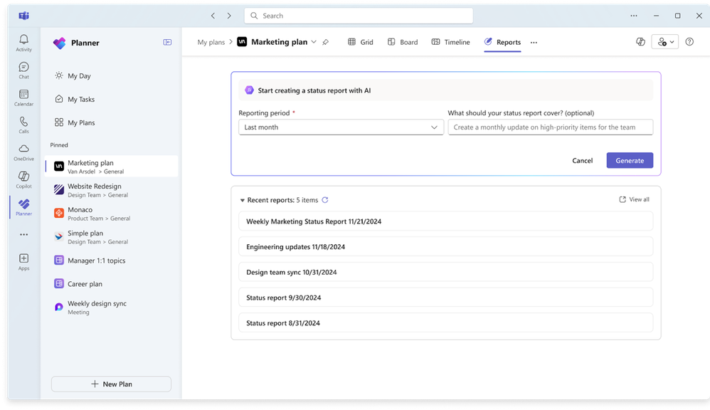 In modern project management, everyone values a clear status report – but creating one can be time-consuming and tedious. We’re excited to introduce the Status Reports feature in the Planner app for Microsoft Teams! With this latest addition to the Project Manager agent, you can eliminate the pain of manual reporting by automatically generating professional, comprehensive project updates in minutes, keeping everyone—from your team to leadership—effortlessly informed.