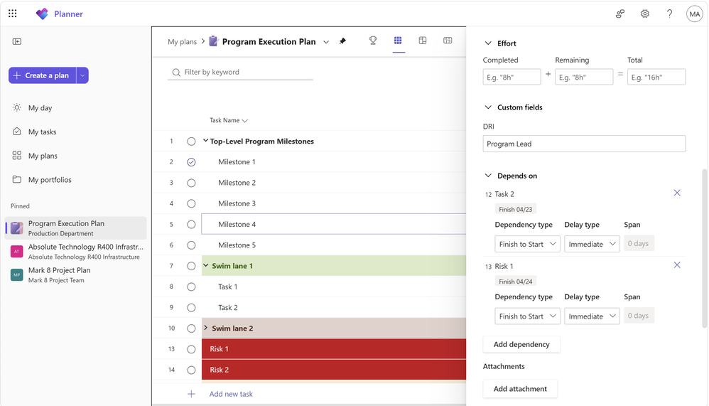 Risks were also tracked directly in Planner, giving program leaders a single view of the work underway and the factors that could impact it. Each risk was represented as a task in the plan and made dependent on the related tasks within each swim lane. Milestones were similarly linked to these risk tasks, keeping mitigation work directly connected to the execution required to reach each milestone.