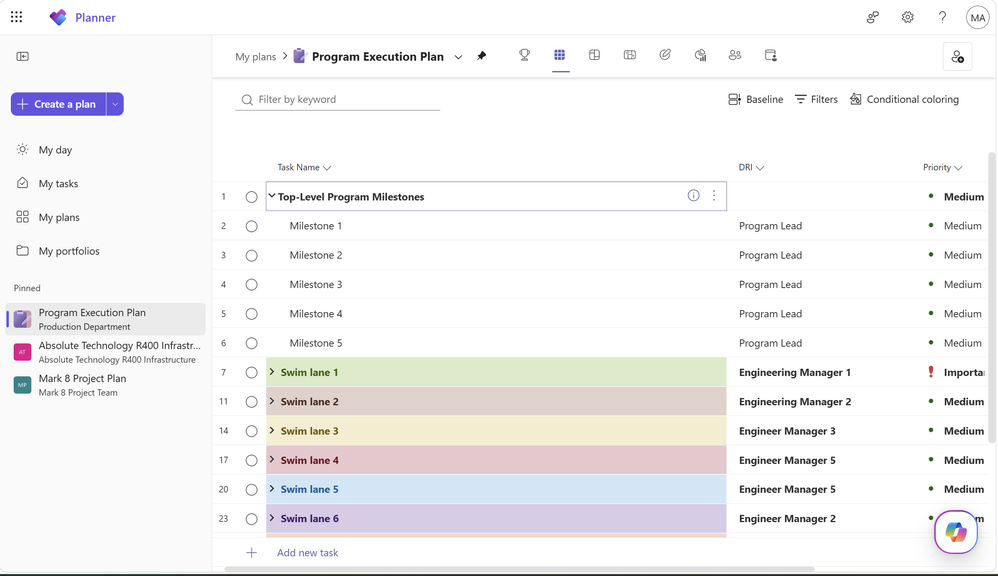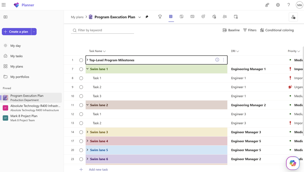 Maia 200 program leads began setting up the plan by creating a series of visual swim lanes for each engineering organization. These were built in Planner as parent tasks and subtasks, covering areas like silicon feature readiness, networking enablement, and system validation. Each swim lane was color-coded to the product or engineering owner responsible for that area, and a custom field was added to track the directly responsible individual (DRI) for each task. This structure made ownership immediately clear throughout the plan. While the plan was originally designed for program-level visibility, it quickly became more than that, as some development leads began using these sections as their primary source of truth for day-to-day project execution.
