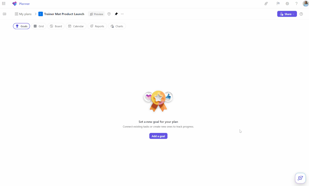Goals view: Basic plans will now include a dedicated Goals view, allowing teams to set clear, well-defined objectives to help prioritize work. By connecting tasks to shared goals, teams achieve greater alignment, gain clarity on priorities, and track progress and outcomes—driving the plan forward together. Access to Goals view in basic plans requires either a Planner premium license or a Microsoft 365 Copilot license.