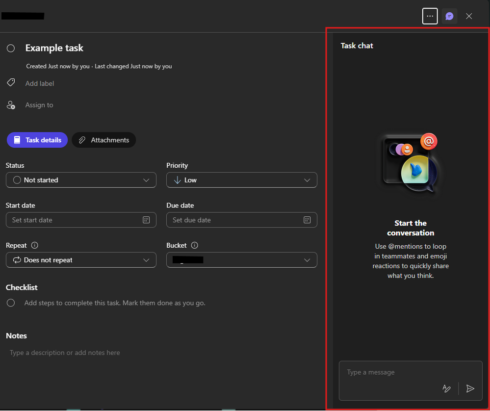 A screenshot of a plan in Planner in Teams shows the new UI for Board view with tasks arranged by bucket.Task chat with @ mentions: A new task chat is coming to basic plans, bringing real-time, threaded conversations directly into tasks, including @ mentions, rich formatting, emojis, and notifications to help keep decisions tied to the specific task at hand. Plan members who are @ mentioned in a task will receive a notification in their Teams Activity feed and via email and can select the notification which takes them directly to the task card for additional context. Note that previously, users received notifications for every task comment, but as a result of customer feedback, we now only send notifications to mentioned users.