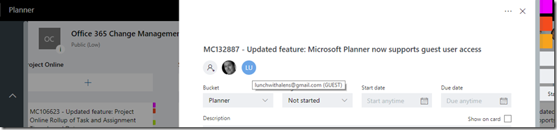 This Planner task version of the message center post is courtesy of my https://blogs.msdn.microsoft.com/brismith/2017/10/23/microsoft-planner-a-change-management-solution-for-office-365/example using Azure Functions. There was also a Tech Community blog post by Jo Parkhurst – https://techcommunity.microsoft.com/t5/Planner-Blog/Bring-your-plans-to-life-with-guests-in-Planner/ba-p/190704 . In this blog post through I’ll walk through some of the aspects of using Guests in Planner.