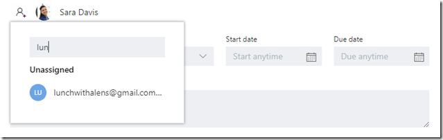 As you can see from the screen capture above I have added a guest user to my plan – the LU icon – mailto:lunchwithalens@gmail.com– which also happens to be me – so not a great example of collaboration – but you get the idea. We don’t yet have the ability directly in Planner to add a guest (coming soon) – but we can assign guests to tasks for guests who are already in the tenant, having been added through Teams for example (ignore the ‘2’ – I forgot to capture a screenshot when I first added me as a guest):