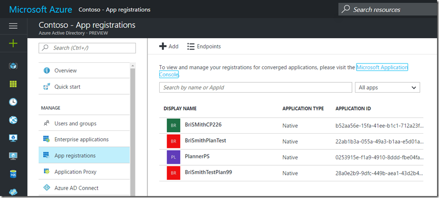 For any application to talk to Graph it will need some permissions – and these are controlled by creating an AppId in Azure and setting the required access levels – then this AppId is passed in when requesting the authentication token. There are a couple of ways of doing this – one through the Admin portal of Office 365 and then Admin Centers and Azure AD – but the one I will walk through is directly in the Azure portal ( https://portal.azure.com ). Either way you should be able to follow the steps.