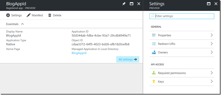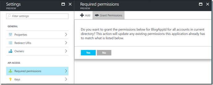 Clicking on the BlogAppId takes me to the details and I can then set myself as the owner, and add the Required Permissions. While I’m on that page I can also copy the Application ID as I will need that in my PowerShell script: