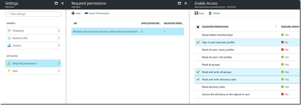 I’ll skip the screenshots adding me as owner – that is pretty straightforward – and go to Required Permissions. One permission is already set – sign in and read user profile, you need to select the additional permissions of read and write all groups and read and write directory data – then click Save.
