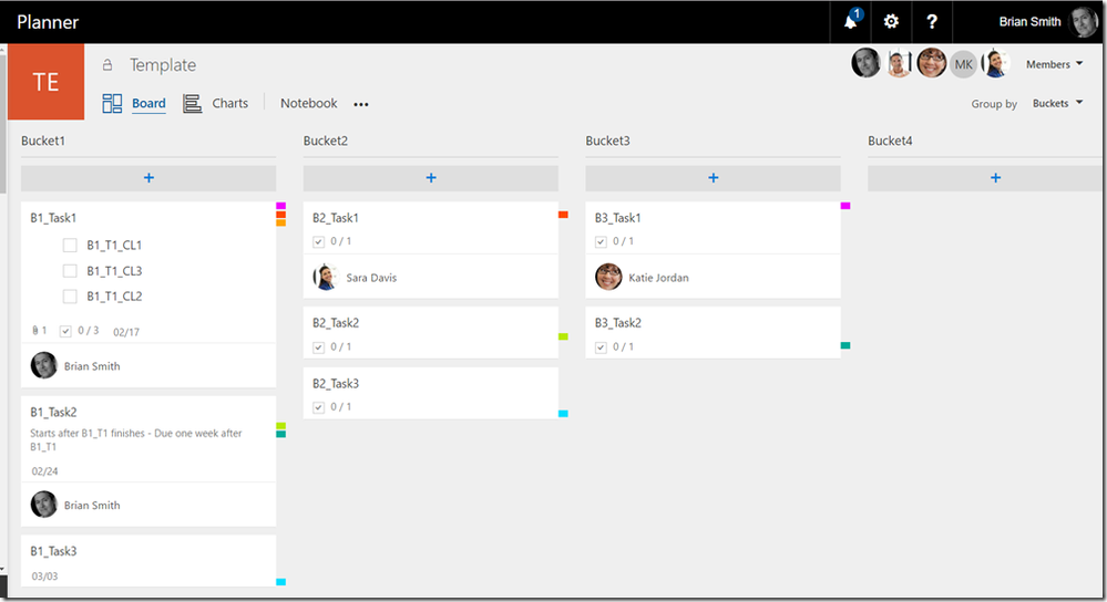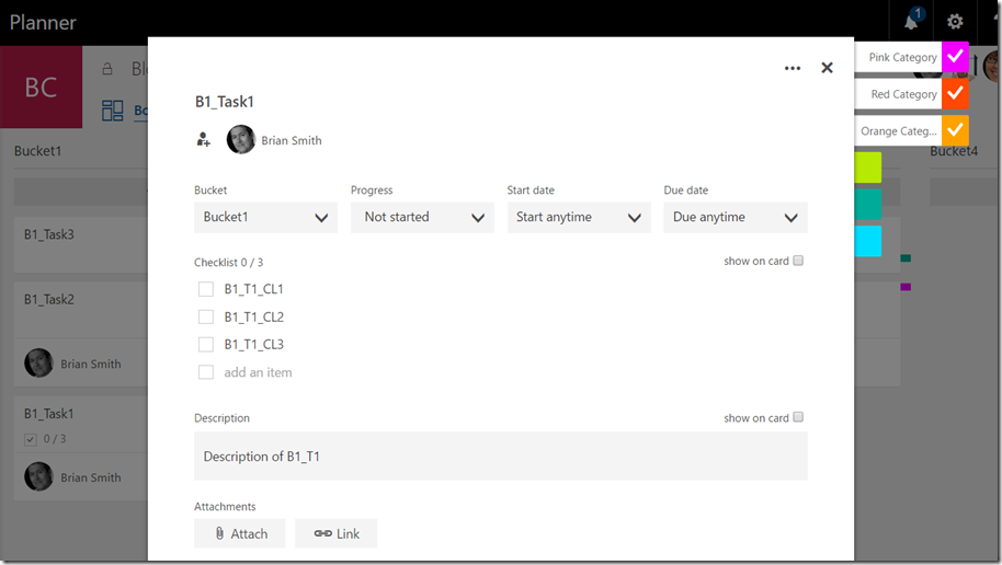 Next we can try a clone. For this I created a Plan called ‘Template’ and set buckets, tasks, assignments, descriptions, checklist and categories. The aim is to create a new plan that has all these same values set. In this case I’m not picking up any dates – but in the real world you could potentially choose a start date and use the date relationships in your ‘template’ to drive the new dates. Here is my template: