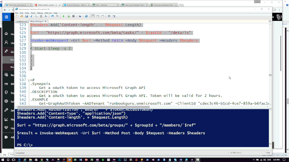 One common request we already have in the roadmap for Microsoft Planner is to support templates – but this will be a few months yet. I wanted to find my way around Graph and what I could do with Plans and tasks – so thought cloning an existing plan might be a good thing to show. This isn’t production ready code – really just a step-by-step using PowerShell to read and write the various entities in Planner. This is all based on the Beta Graph for Planner - https://graph.microsoft.io/en-us/docs/api-reference/beta/beta-overview and when this goes to General Availability - hopefully this quarter - I will make the necessary edits. There may be some slight changes to the endpoints. Thanks to one of our MVP’s - Jakob Gottlieb Svendsen - mailto:jgs@coretech.dk – http://blog.coretech.dk/jgs as I stole used some of his code from his example Graph scripts published at https://www.powershellgallery.com/packages/MicrosoftGraphAPI/0.1.3/Content/MicrosoftGraphAPI.psm1 to get the authentication tokens.
