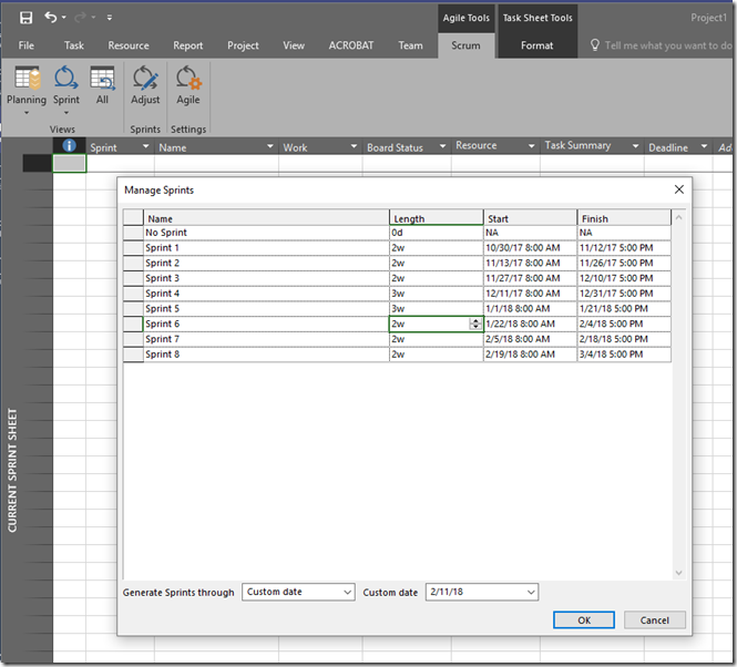 One other support tip is for adding sprints – as this has raised a few questions with the early users. You do this via the Adjust Sprints option – where you can generate new sprints through to a custom date, for example – and here I’ve also changed a couple of the lengths to 3 weeks over the local holiday period at the end of the year.