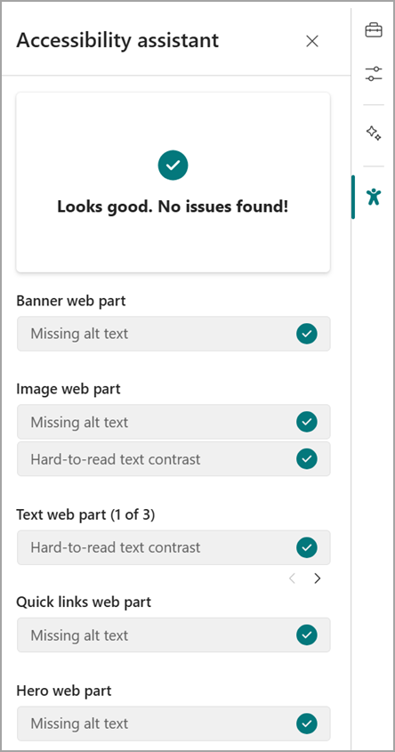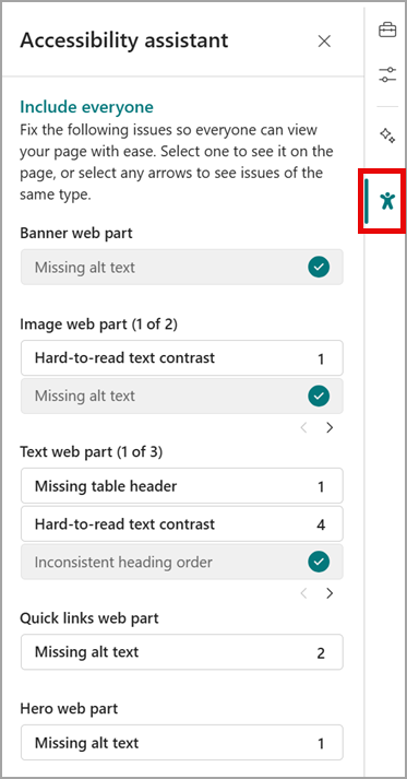After this rollout, authors can initiate an accessibility test while editing a page. Authors can select the Accessibility assistant icon from the right vertical toolbar. The Accessibility assistant will support five web parts: Banner, Text, Image, Hero, and Quick Links.