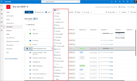 A SharePoint document library with an item’s menu expanded (in grid view):