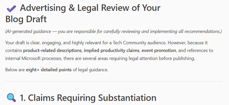 This is an actual screenshot from the Marketing Review Agent's feedback on this very blog postCompliance documents, stored in SharePoint, are the sole source of truth for the agent, and plain language instructions ensure each time the agent evaluates a blog it does so exactly the same way - over and over and over ... was there a policy change? Marketing simply updates the knowledge sources, the agent immediately applies the change to the next review it makes.