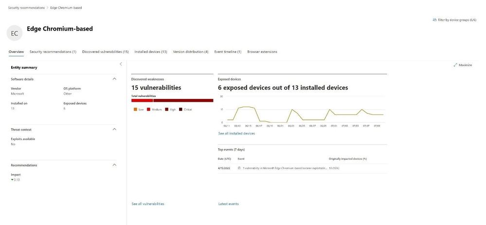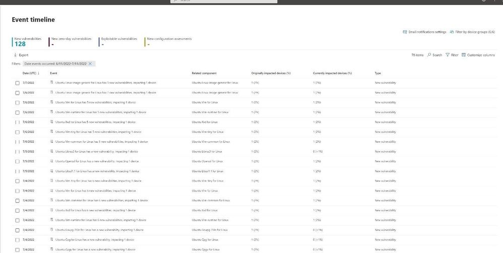 Understanding when an organization was first exposed to a weakness is critical. MDVM provides an event timeline that shows when each weakness was discovered, what percentages of devices were impacted when it was originally discovered, and what percentage of devices are currently impacted.