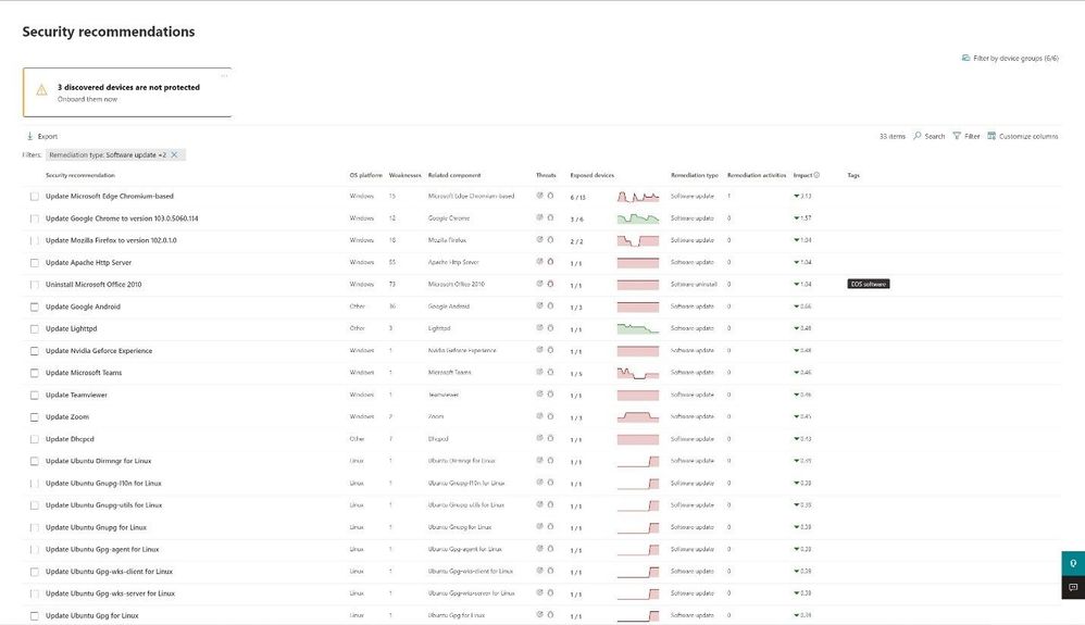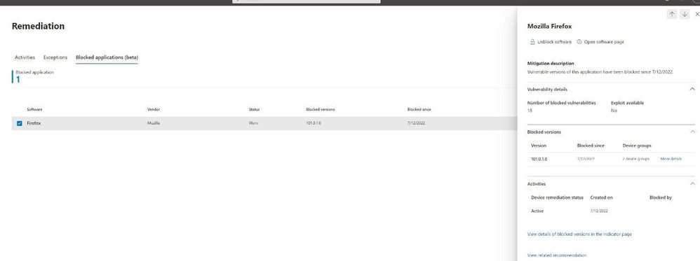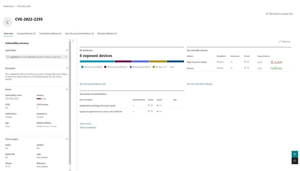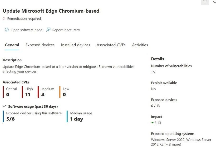 Upon selecting a recommendation, a window opens with an overview of the recommendation and a series of tabs showing the number of exposed devices, devices with the software installed, activities and any CVE’s related to the software.