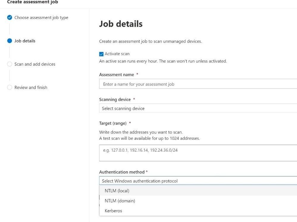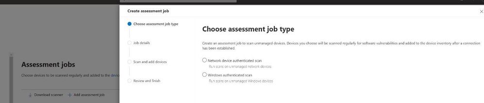 Earlier, I mentioned that MDVM can also discover vulnerabilities in unmanaged devices. This can be done in a few ways. The first, is via an authenticated scan. This method can be used for network devices or Windows devices that have not yet been onboarded into MDE. From the MDE setting menu, staff selects “Assessment jobs” and then selects which type of assessment they would like to perform.