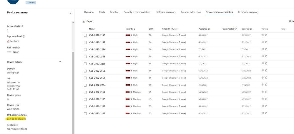 The below device was discovered on the network however, is not managed by MDE, nor are authenticated scans against this device. The device has a status of “Can be onboarded” but still lists several CVEs on the machine. This data is surfaced during active and passive scanning that is done via a managed MDE endpoint.