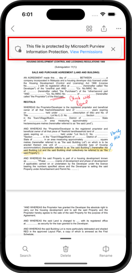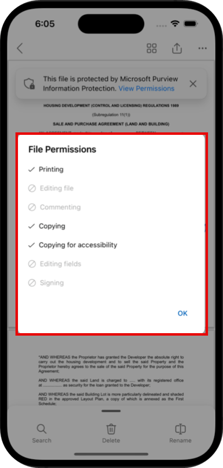 - When users open the PDF file with a sensitivity label in OneDrive for iOS or Android, a banner at the top of the screen reads, "This file is protected by Microsoft Purview Information Protection. View Permissions":