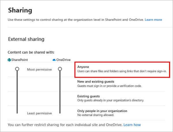 We recommend using the Anyone link sharing setting, which admins can enable in the SharePoint admin center as shown below. Learn how to configure external sharing to meet your organization's needs: Plan and deploy a file collaboration environment - SharePoint - SharePoint in Microsoft 365 | Microsoft Learn