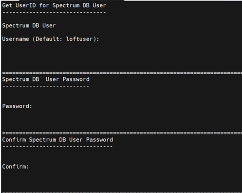 Step 9: Enter the username and password that you set for the Spectrum database user during the Spectrum database installation, and then confirm the password.