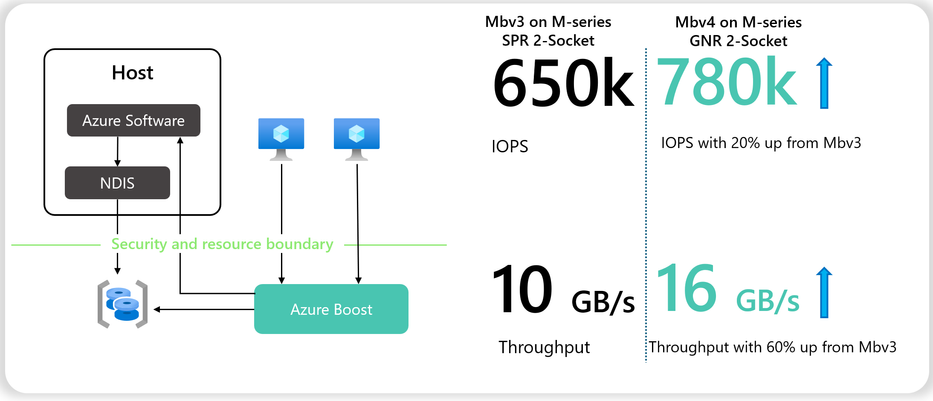 As we released Mbv3 Series (Mbsv3 and Mbdsv3 Series)last year, demonstrating 650K IOPS and 10GBps throughput of remote disk storage with Premium SSD v2 and Ultra Disk on our 2-socket Azure Boost platform—already a major milestone for cloud performance, now, we’re thrilled to announce to the community another leap forward with the coming Standard_M304bs_4_v4 VM size from new Mbv4 Series on the 6th generation Intel® Xeon® Scalable processors, which delivers 20% higher IOPS and 60% more bandwidth throughput than Mbv3, reaching 780K IOPS and 16 GBps throughput on remote storage. Below is the demo result from our lab for this new VM series,