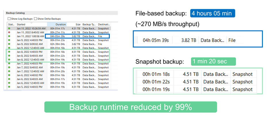 Snapshots also provide key advantages for restore and recovery operations. A volume revert operation enables the restoration of an entire database to any point in time, based on the available snapshots. Such restore processes are finished in less than a minute, independent of the size of the database. Because several online snapshot backups are created during the day, the time needed for the recovery process is significantly reduced relative to a traditional backup approach. Because a restore operation can be performed with a snapshot that is only a few hours old (rather than up to 24 hours), fewer transaction logs must be applied.