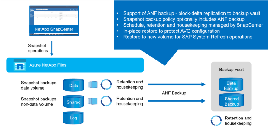 SnapCenter provides the orchestration of efficient and fast backup and restore operations and simplifies the configuration and execution of SAP HANA on Azure NetApp Files snapshot-based primary data protection as well as snapshot archival for longer term backup. Scheduling and retention management is fully integrated on the HANA database and ANF infrastructure layer to allow transparent operations by database admins.