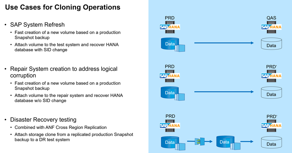 The best-known use case is the SAP System Refresh, where data from the production system needs to be copied to a test or a QA system. By leveraging the Azure NetApp Files restore volume from snapshot (aka cloning) feature, you can provision the volume for the test system from any snapshot of the production system in a matter of seconds. In a second step the new volume needs to be attached to the test system and the HANA database needs to be recovered.