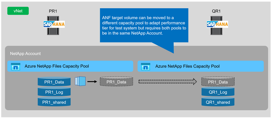 - Source and target HANA system must be in the same VNet, so that the target HANA system can mount the new volume created from the source snapshot.