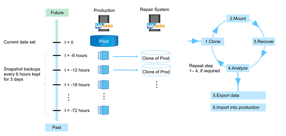 The second use case is the creation of a repair system, which is used to address logical corruption in the production system. In this case an older snapshot backup of the production system is used to start a repair system, which is an identical clone of the production system with the data before the corruption occurred. The repair system is then used to analyze the problem and export the required data before it got corrupted.