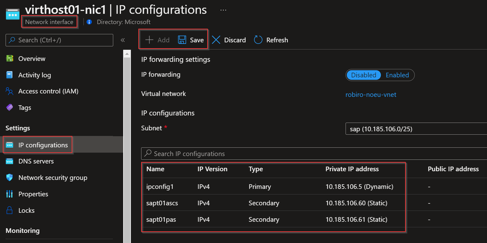 Most Linux distributions operate the NIC card with DHCP by default. That means Azure provides the IP (and possibly DNS servers, if configured on Azure virtual network) to the OS. SAP relevant OS images should pick-up the secondary IP address(es) that you configured within Azure immediately through DHCP. Don’t rely on DHCP entirely, however, since for some configurations like SAP LaMa or HA setups with Pacemaker require you to disable SUSE Network Manager and thus you need to add secondary IPs manually.